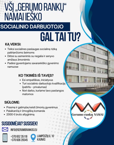 Jei socialinis darbas Tau – ne tik profesija, bet ir pašaukimas, kviečiame prisidėti prie mūsų misijos padėti žmonėms, kuriems pagalba reikalinga labiausiai. Mūsų komandoje visi esame dėl bendro tikslo: kurti saugesnę, šiltesnę ir labiau palaikančią bendruomenę.