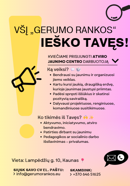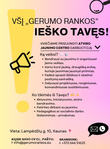 Kviečiame prisijungti Atviro jaunimo centro darbuotoją, kuris nori prisidėti prie jaunimo ugdymo, įkvėpti, padėti augti ir kurti saugią bei draugišką erdvę.